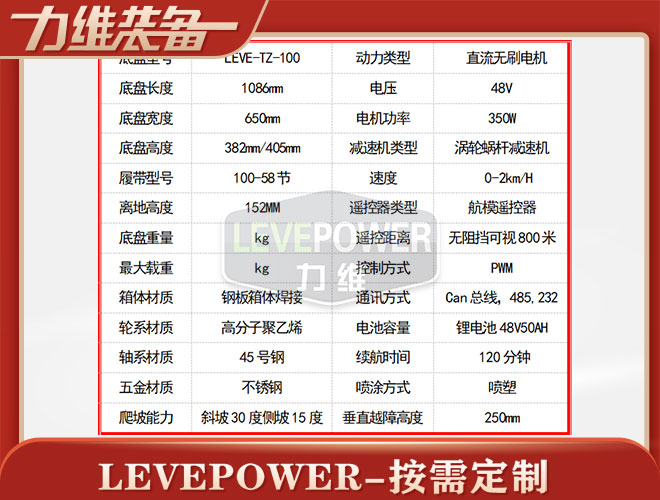 特種橡膠履帶底盤長(zhǎng)1086mm,履帶底盤寬650mm,履帶底盤高382mm,無線遙履帶底盤搭載48V350W直流無刷永磁電機(jī),RV50渦輪蝸桿減速機(jī),動(dòng)力更強(qiáng)。履帶底盤采用48V50AH鋰電池,續(xù)航時(shí)間更長(zhǎng)。履帶底盤框架采用鋼板箱體焊接而成,底盤承載力大,是一款全地形履帶底盤。