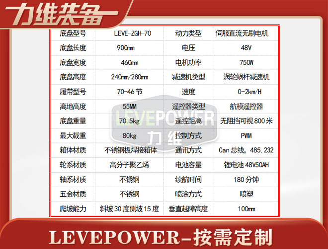 履帶底盤長900mm,履帶底盤寬460mm,履帶底盤高280mm,無線遙控履帶底盤箱體采用鋁合金材質(zhì)焊接而成,防腐性能好。履帶底盤動力采用48V750W直流無刷電機,渦輪蝸桿減速機動力更強,轉(zhuǎn)彎靈活。履帶底盤電池采用48V20AH鋰電池,續(xù)航時間更長,是一款不錯的機器人橡膠履帶。