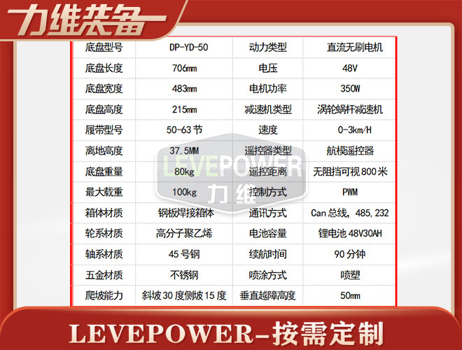 橡膠履帶底盤長706mm,橡膠履帶底盤寬483mm,橡膠履帶底盤高215mm,無線航模遙控履帶底盤采用48v350W直流無刷永磁電機(jī),渦輪蝸桿減速機(jī)動力更強(qiáng),轉(zhuǎn)彎靈活,操控簡單。履帶底盤電池采用48V30AH鋰電池續(xù)航時間更長。履帶底盤箱體采用鋼板焊接而成,輪系采用高分子聚乙烯,履帶底盤整體重量輕,耐磨性強(qiáng)。