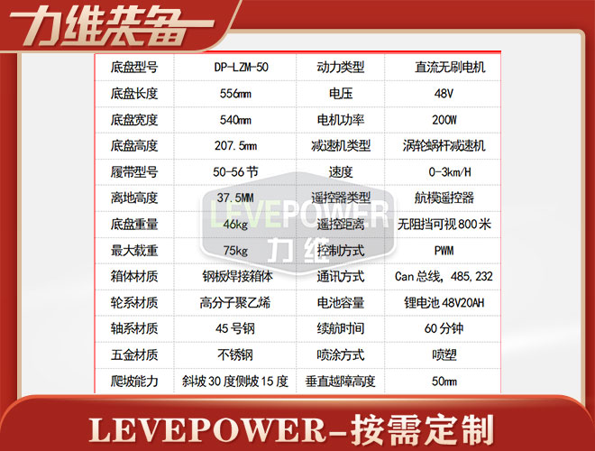 橡膠履帶底盤長556mm,橡膠履帶底盤寬540mm,橡膠履帶底盤高207.5mm,無線遙控履帶底盤采用48v200W直流無刷永磁電機,渦輪蝸桿減速機動力更強,轉(zhuǎn)彎靈活,操控簡單。履帶底盤電池采用48V20AH鋰電池續(xù)航時間更長。履帶底盤箱體采用鋼板焊接而成,輪系采用高分子聚乙烯,履帶底盤整體重量輕,耐磨性強。